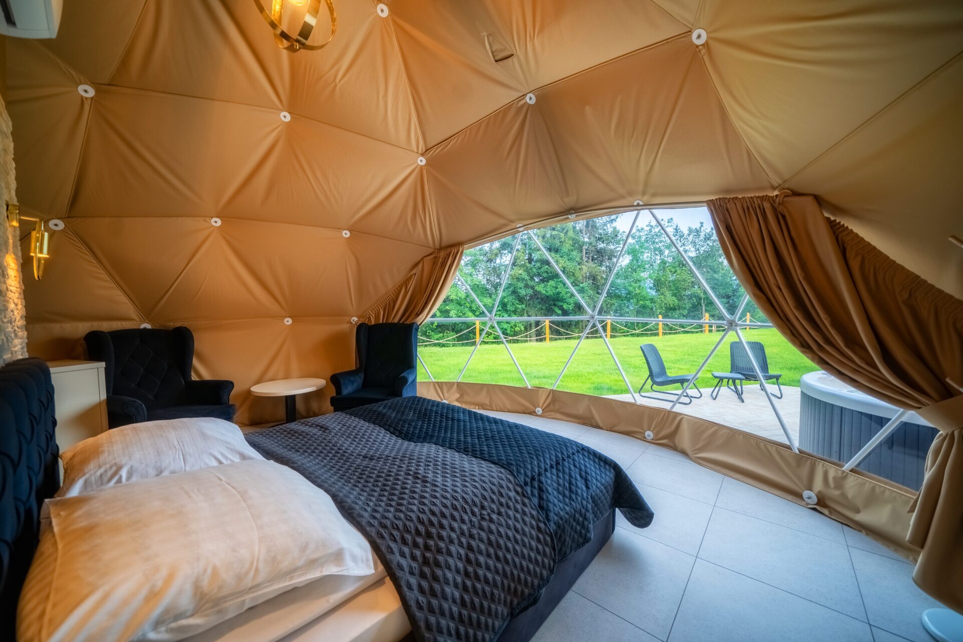 Wyjątkowa kopuła z akcentami w kolorze jasnobrązowym z prywatnym jacuzzi.