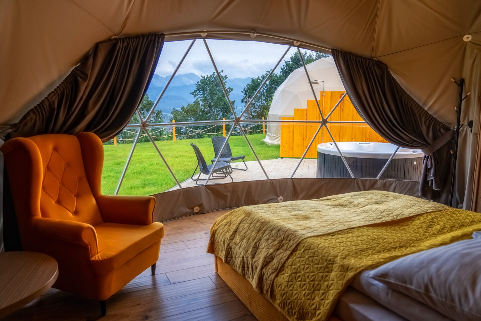 Wyjątkowa kopuła z akcentami w kolorze pomarańczowym z prywatnym jacuzzi.