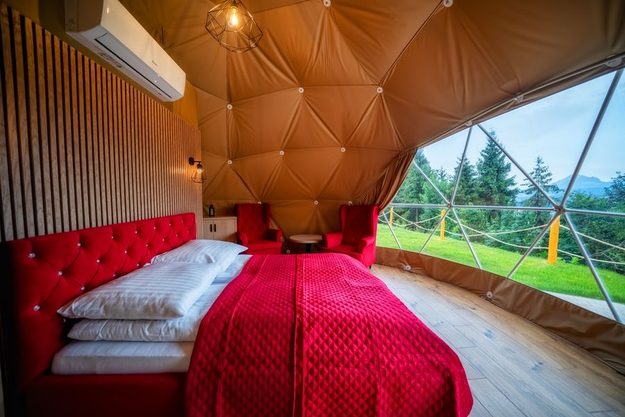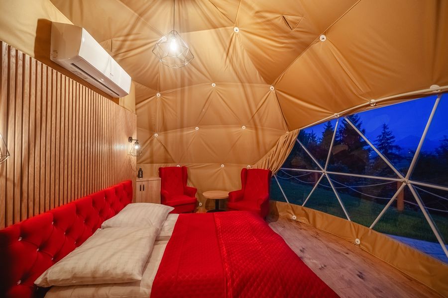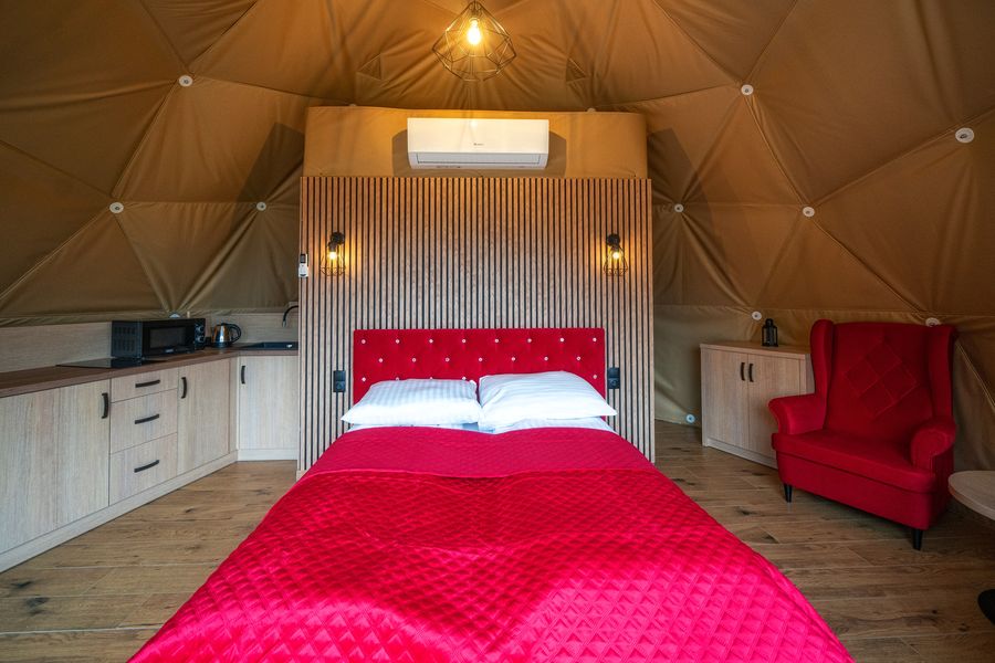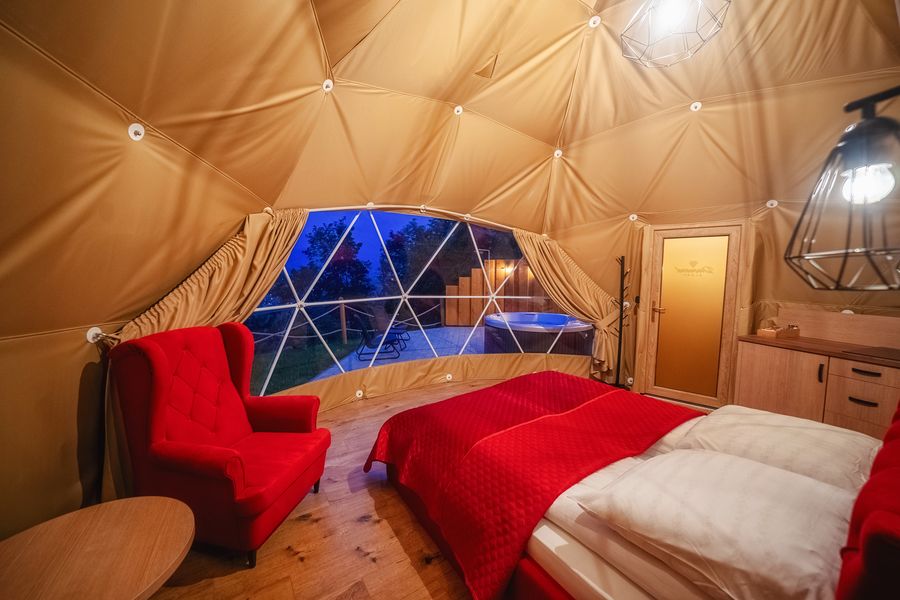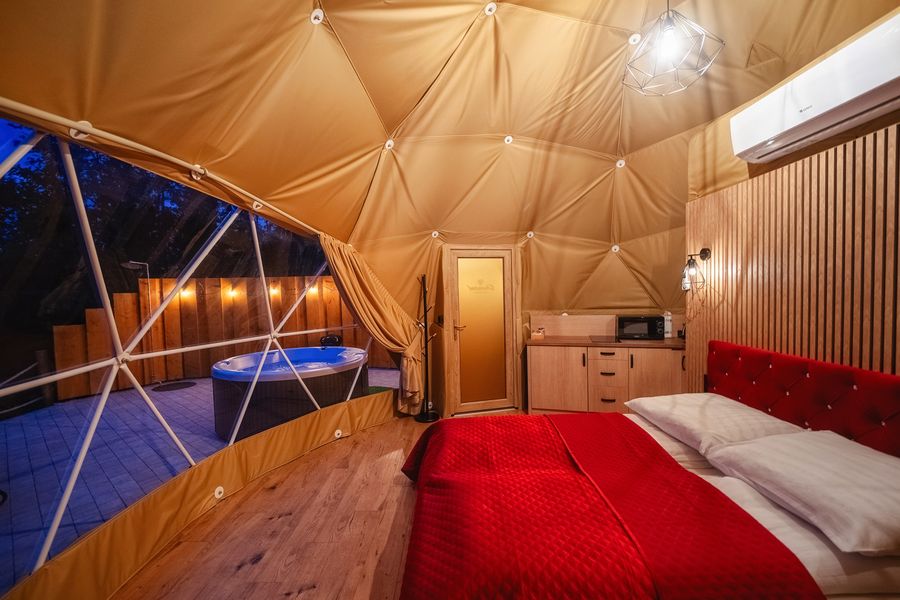 Wyjątkowa kopuła z akcentami w kolorze różowym z prywatnym jacuzzi.
